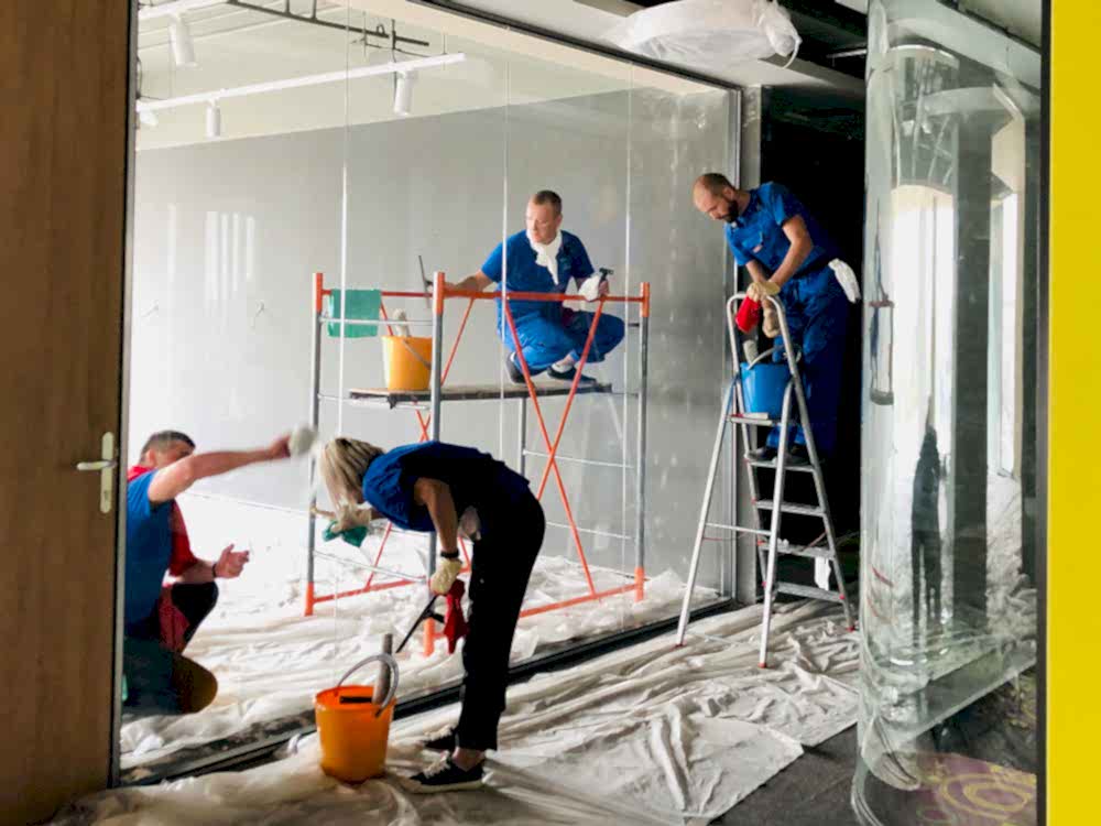 Строительные и ремонтные работы оставляют сложные загрязнения: пыль, цементные растворы, краски, клей, скотч, солевые потеки, пленки и др. При сильной загрязненности стекол Pin-Up смесями, красками выполнять мойку своими силами не рекомендуется, так как есть риски поцарапать стекло. Для такой мойки необходим опыт, профессиональный инструмент и специализированная химия.